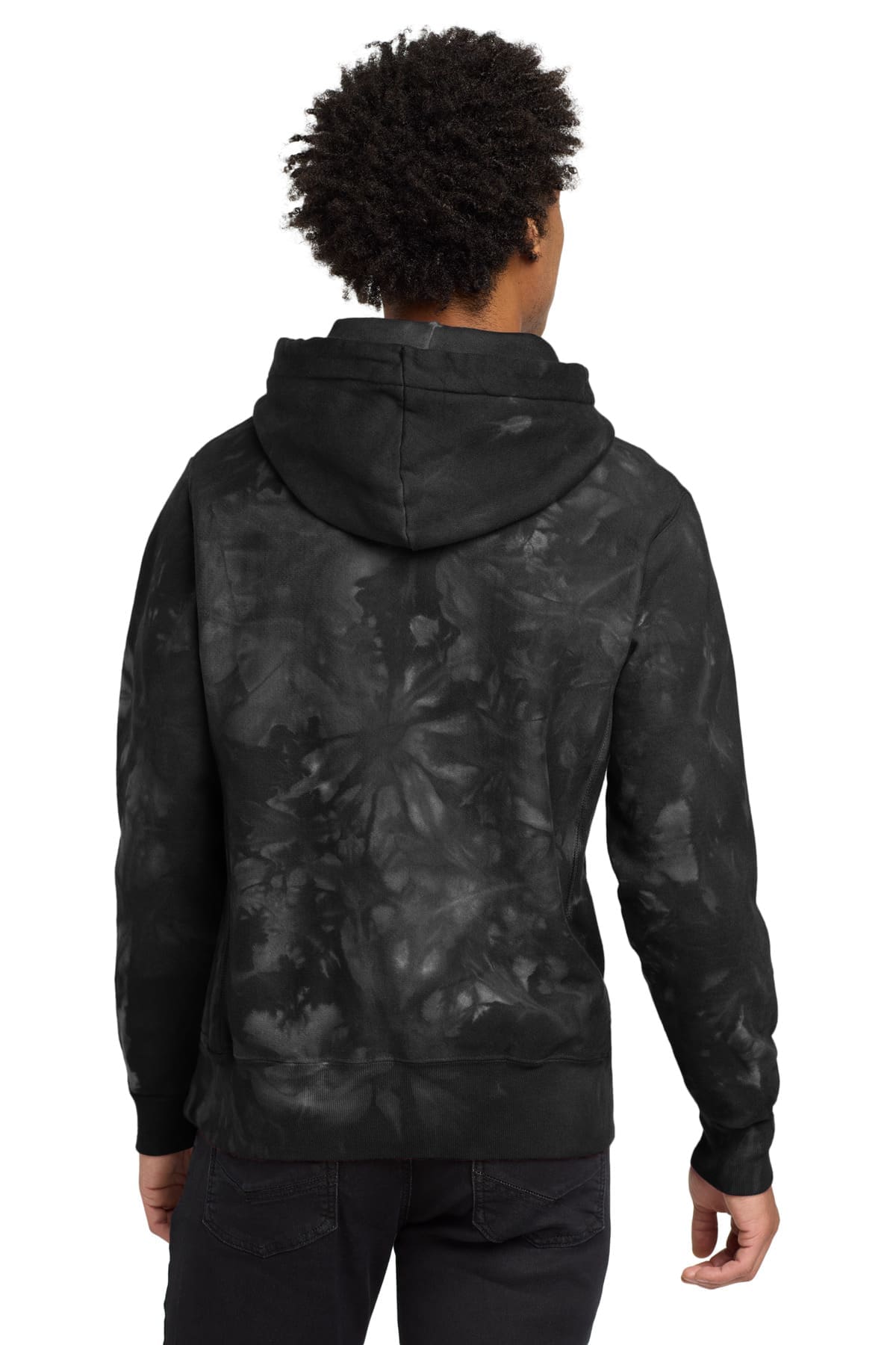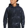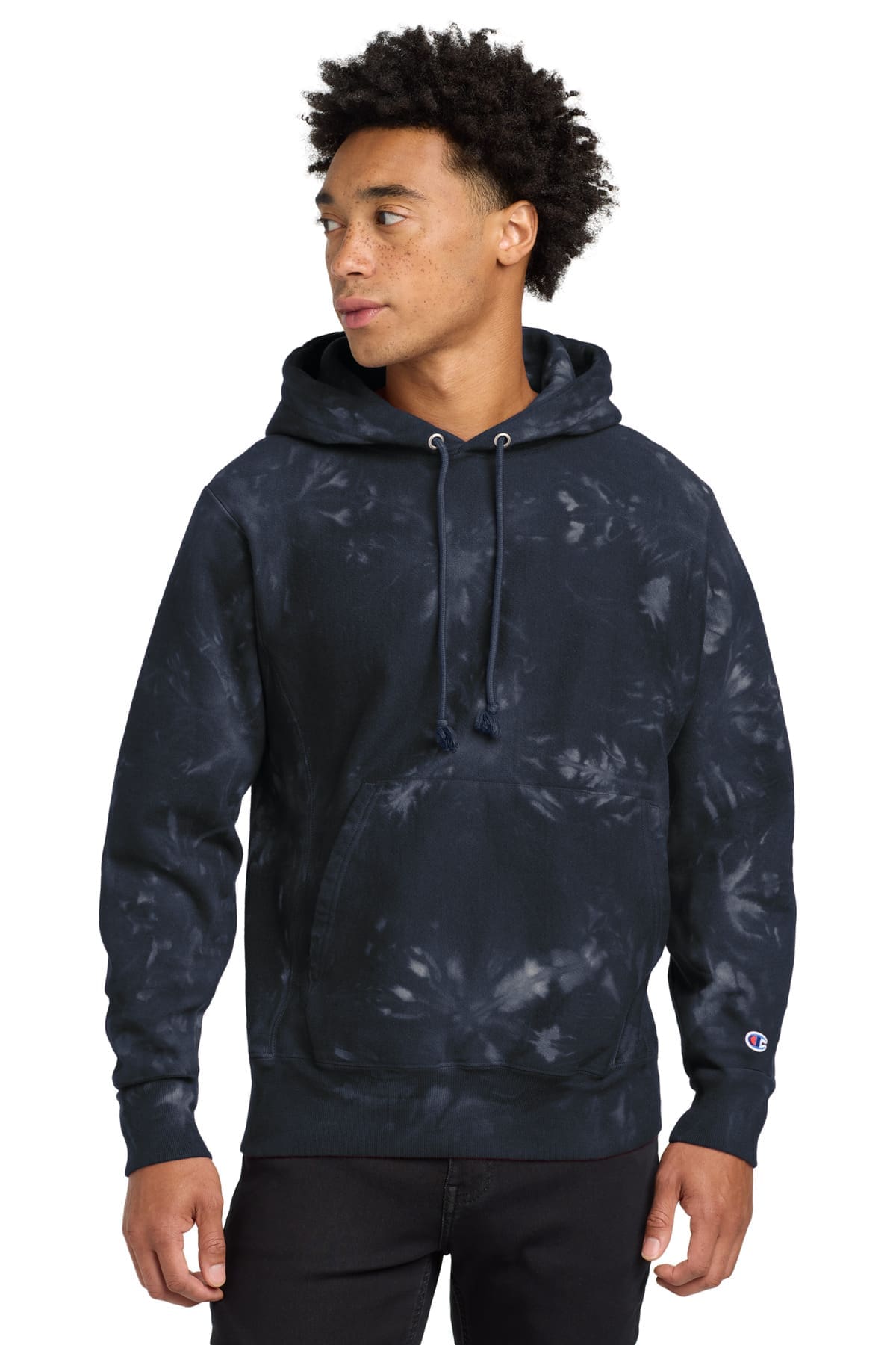 12-ounce 82/18 cotton/poly fleeceReverse Weave cross-grain cut resists shrinkageUnique scrunch-dye tie-dye patternTwo-ply hood with dyed-to-match drawcords 1×1 rib knit side panels sleeve cuffs and hem Front pouch pocketEmbroidered Champion- C logo at left cuffWoven back neck label
