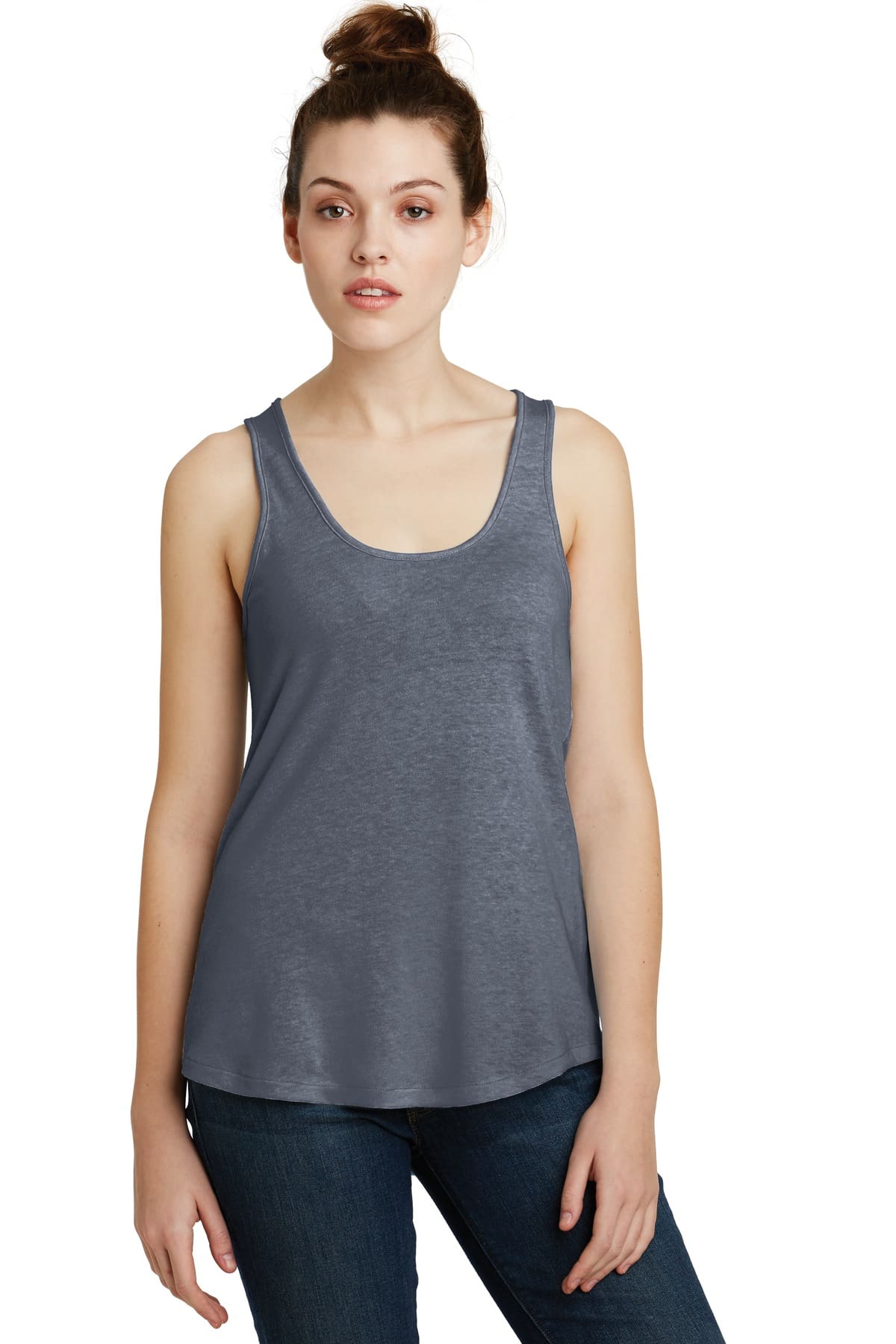 A loose fit a high-low hem and a lower scoop neckline give this tank a flattering shape while the soft 50/50 fabric keeps it comfortable. 4.4-ounce 50/50 cotton/polyClassic fit Tear-away label Center back seam with tonal stitch detail Binding at neckline and armholes Curved shirttail hemVintage 50/50 fabric infuses each garment with unique character. Please allow for slight color variations. Alternative Apparel reserves the right to prohibit the addition to any Alternative Apparel product any mark name design or logo that does not meet the high standards of the brand. Please contact your sales representative with questions. These products may not be resold without embellishment.