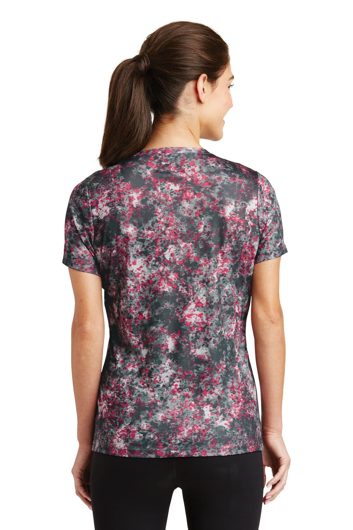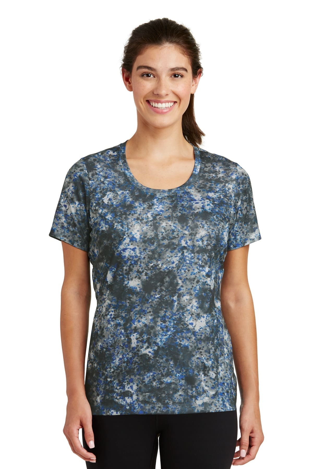 This moisture-wicking tee features an allover sublimated print that has a granite-like look. 4-ounce 100% polyester interlock Gently contoured silhouette Tag-free label Set-in sleeves