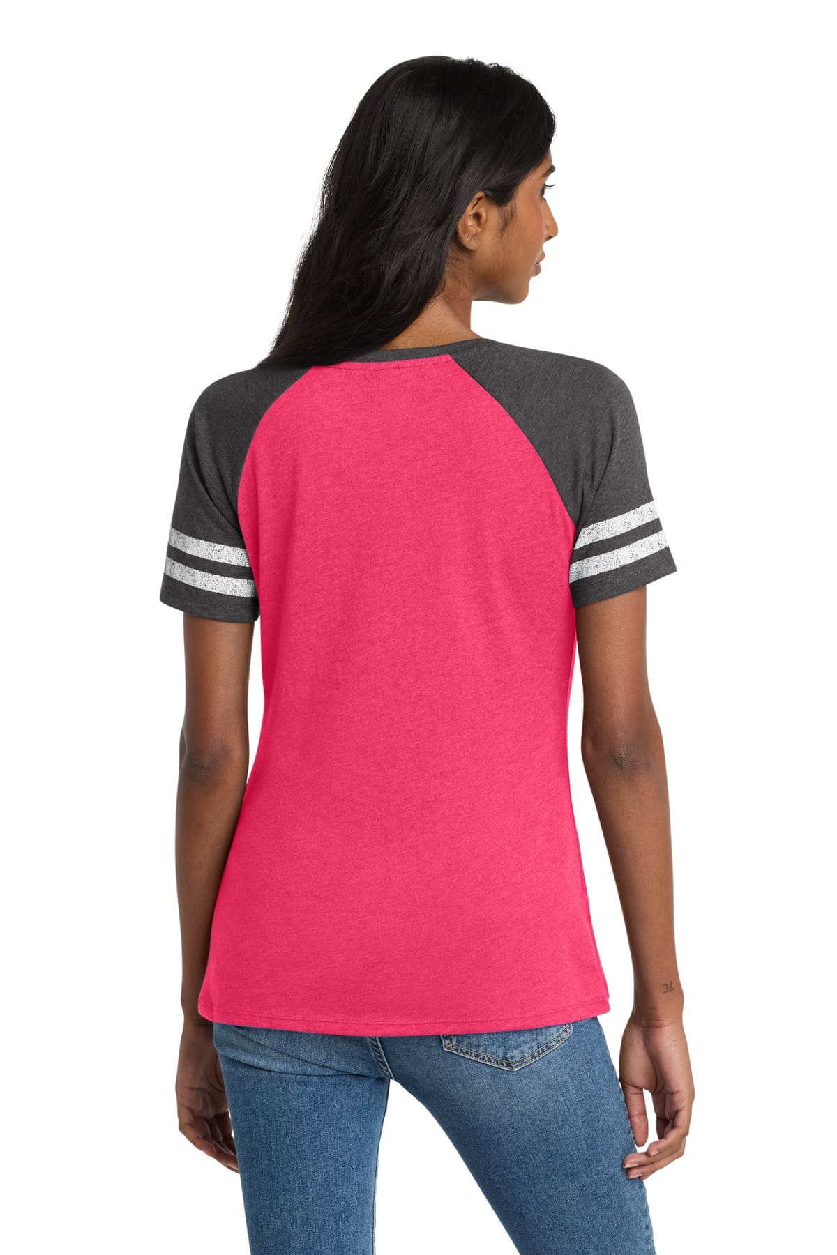 Feel like a winner in this comfortable tee.4.6-ounce (155 GSM)60/40 combed ring spun cotton/polyester 32 singlesTear-away labelCrossover V-neckBack neck tapeDistressed printed stripes at sleeve