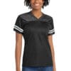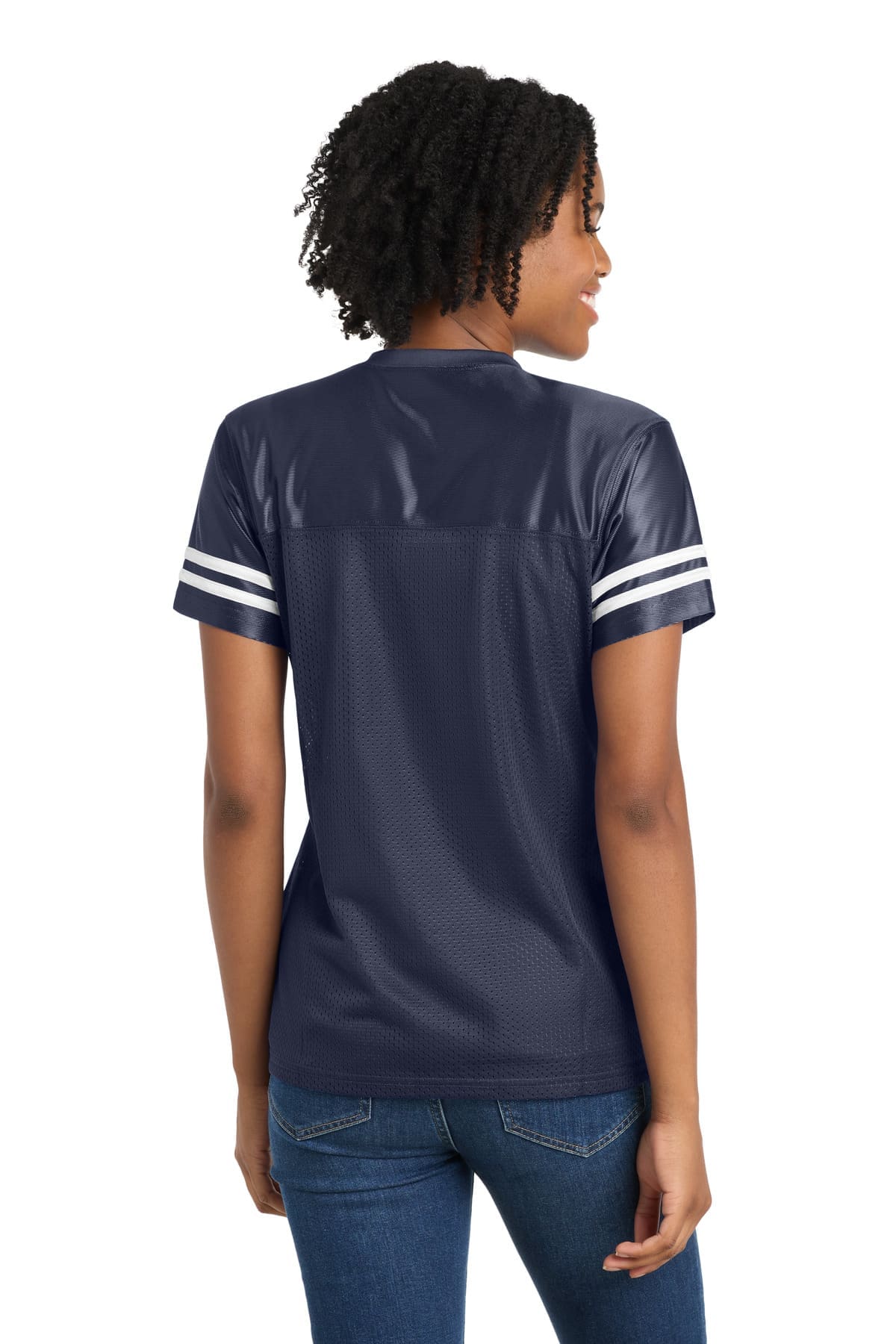 True athletic-looking jerseys featuring a breathable mesh body and color-locking PosiCharge technology.3.6-ounce 100% polyester mesh body with PosiCharge technology 4.1-ounce 100% polyester dazzle yoke and sleeves with PosiCharge technology Removable tag for comfort and relabelingCrossover rib knit V-neck Set-in sleeves Sleeve stripes Not designed to be worn over pads